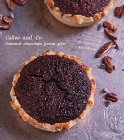 Caramel chocolate pecan pies
