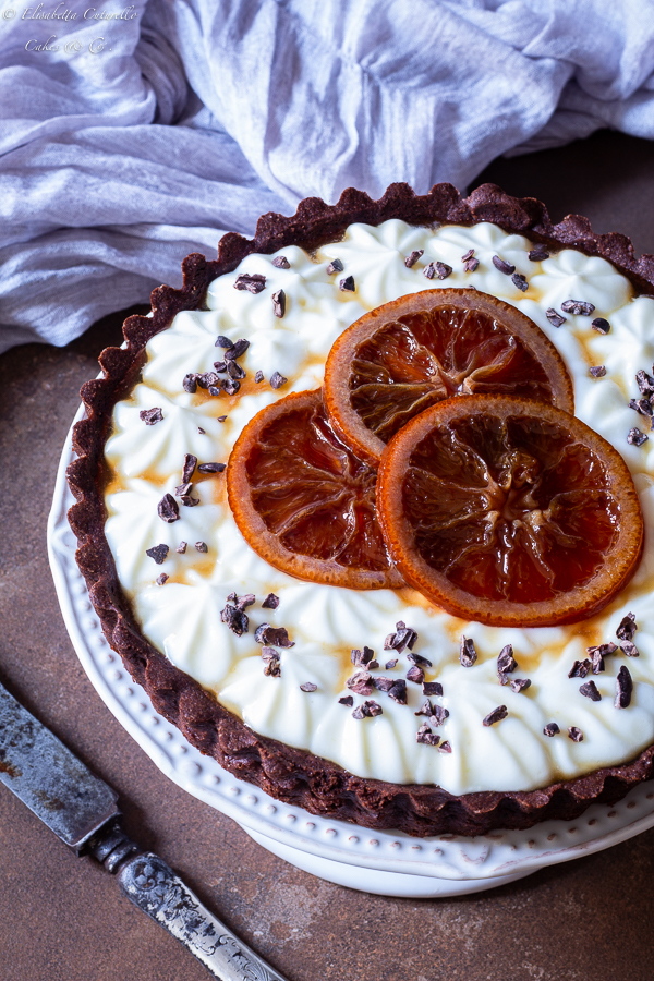 Crostata al cacao con marmellata d’arance amare crema di ricotta montata e arance al brandy