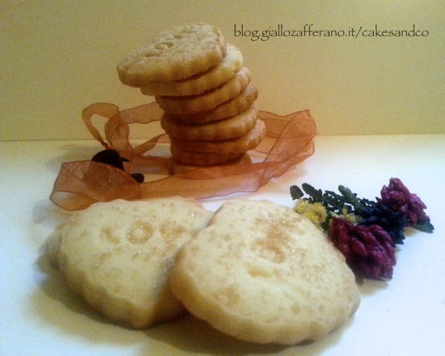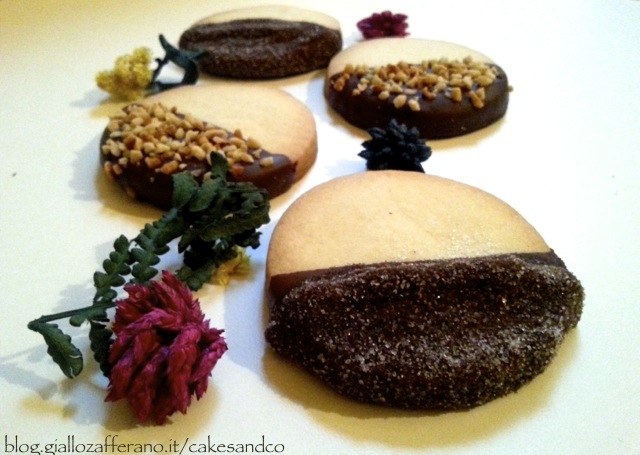 Io ho decorato una parte di biscotti con lo zucchero di canna prima di infornarli, mentre gli altri li ho decorati dopo cotti immergendoli, una volta freddi, per metà nel cioccolato fondente fuso e passandone alcuni, in una ciotola piena di zucchero semolato, e spargendo sui rimanenti della granella di nocciole. Aspettate che il cioccolato si indurisca prima di servirli.