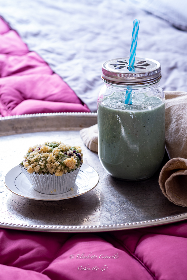 Muffins vegani alla Spirulina Becagli e mirtilli e frullato alla banana canapa e Spirulina Becagli per una colazione vegan golosa e ricca di nutrienti.