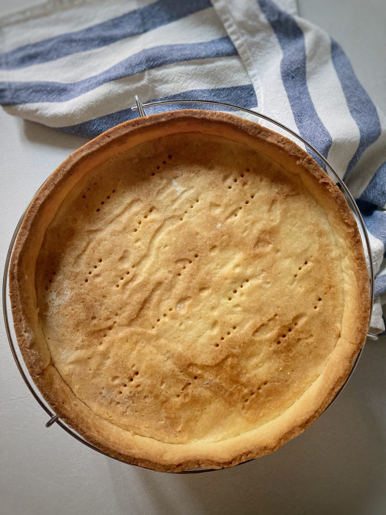 - Il giorno dopo stendete la pasta frolla con uno spessore di 3 mm sul piano di lavoro leggermente infarinato. Rivestite lo stampo imburrato e fate riposare in frigorifero per almeno 30 minuti meglio un'ora. Quando la frolla sarà ben fredda preriscaldate il forno a 160° e cuocete in bianco per 40 minuti. Quando la sfornate fatela raffreddare sopra una gratella.