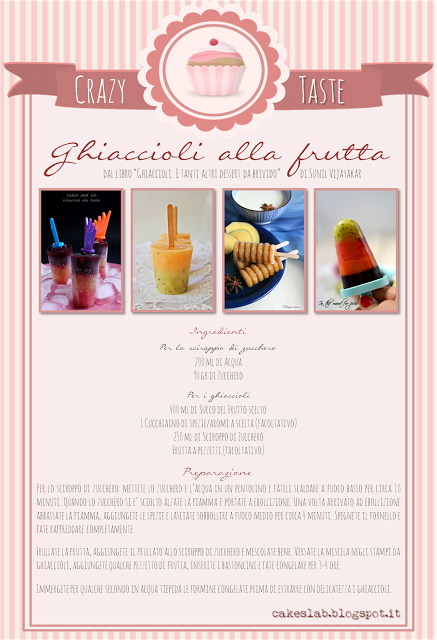 Finalmente è arrivato luglio e con lui possiamo dare definitivamente il benvenuto all’estate! Noi del Cakes Lab abbiamo deciso di celebrare questa stagione scegliendo di testare un libro il cui titolo promette di deliziare e rinfrescare la nostra e la vostra estate si tratta di “Ghiaccioli. E tanti altri dessert da brivido” di Sunil Vijayakar. Per darvi un assaggio delle tante ricette che si trovano in questo libro coloratissimo abbiamo scelto di proporvi per il Crazy Taste dei semplici ghiaccioli alla frutta di cui, partendo dalla ricetta base che trovate nella locandina del crazy taste, potrete divertirvi a creare le vostre varianti come abbiamo fatto anche noi. Ricordatevi però di non snaturare la ricetta base, di mantenere invariate le proporzioni degli ingredienti e di utilizzare nella preparazione gli ingredienti che non sono facoltativi o che non possono essere variati.