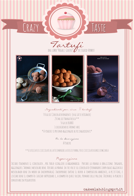 Vi ricordo come sempre che potete ancora partecipare al Crazy Taste di questo mese. Noi del Cakes lab vi aspettiamo per giocare con noi rivisitando i tartufi, altro dolcetto perfetto da regalare.