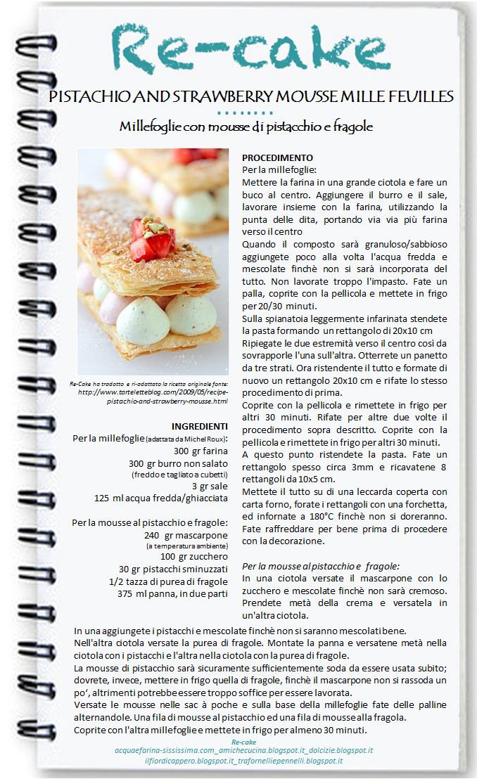 Questo dolce super goloso segna la mia prima partecipazione al Re-Cake. Il Re-Cake è un contest a cadenza mensile che nasce dalla passione per la cucina e la gioia di divertirsi assieme, preparando golosità di ogni genere, di 5 Food blogger Sara, Miria, Silvia, ed Elisa e Silvia che ogni mese scovano sul web la ricetta di un dolce che le attira, solitamente ricette in lingua straniera, ne traducono la ricetta, ne convertono le misure e creano una locandina con foto, ricetta e procedimento da seguire per realizzarla e la pubblicano sui loro blog e sul gruppo facebook del contest “Re-Cake wants you”. Ogni partecipante potrà decidere se rifare esattamente la ricetta originale oppure modificarla fermo restando degli elementi che non potranno subire variazioni, per non snaturare l’essenza stessa del dolce. Ormai per il gruppo, quella che per me è la prima, è la sesta Re-Cake. Questa volta la sfida era la millefoglie con mousse di pistacchio e fragole. Io ho deciso di modificare un poco la ricetta. Ho preparato la pasta sfoglia classica invece che quella veloce, perchè non avevo mai preparato la sfoglia in casa e se proprio dovevo imbarcarmi in questa avventura volevo farlo senza scorciatoie e vincere la paura della sfoglia classica. Ho infine sostituito la mousse di fragole con quella di mirtilli per dare un bel tocco di lilla al dolce, colore questo che io adoro. Il risultato è stato una vera delizia, e malgrado l’ansia da sfoglia che mi ha tormentato per due giorni direi che ne è valsa veramente la pena.