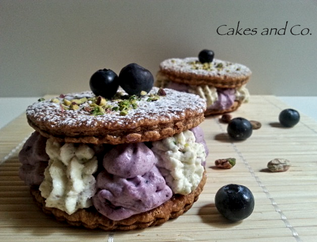 Per la mousse ai mirtilli, come prima, mescolate in una ciotola mascarpone e zucchero, unite quindi la purea di mirtilli ben fredda. Semi montate la panna con le fruste ed unitela al composto di mascarpone e mirtilli. Le vostre mousse sono pronte, ponetele in due sac a poche munite di bocchetta a stella.