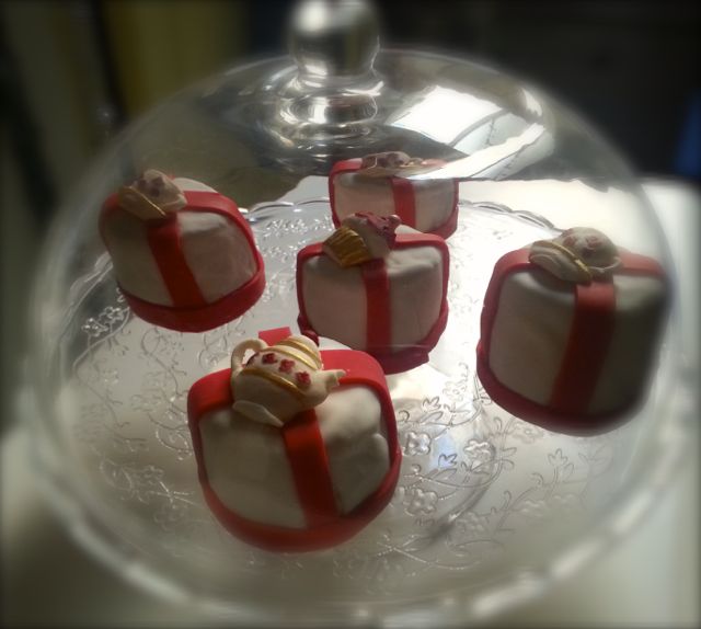 - decorazioni in gum past a forma di tazze da tè, teiera e pasticcini.
