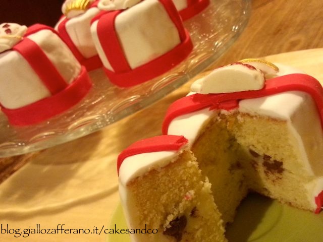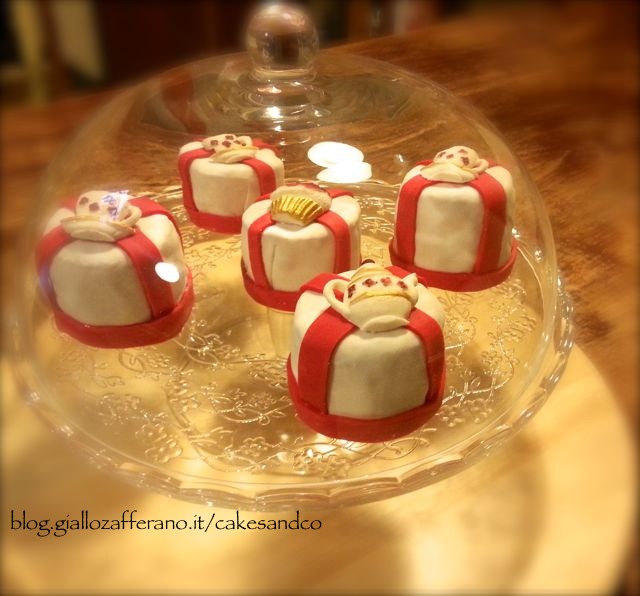 Una volta ricoperte le tortine con la pasta di zucchero bianca, stendete la pasta di zucchero rossa e ricavatene delle strisce, due per ciascuna tortina e posizionatele sulle tortine dopo aver spennelleto la parte a diretto contatto con la tortina con il cmc.