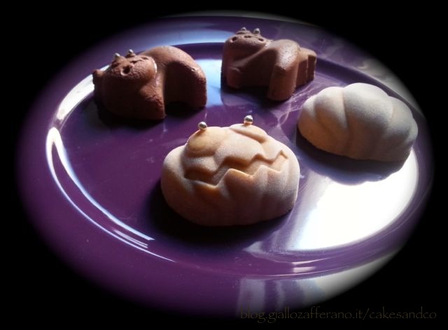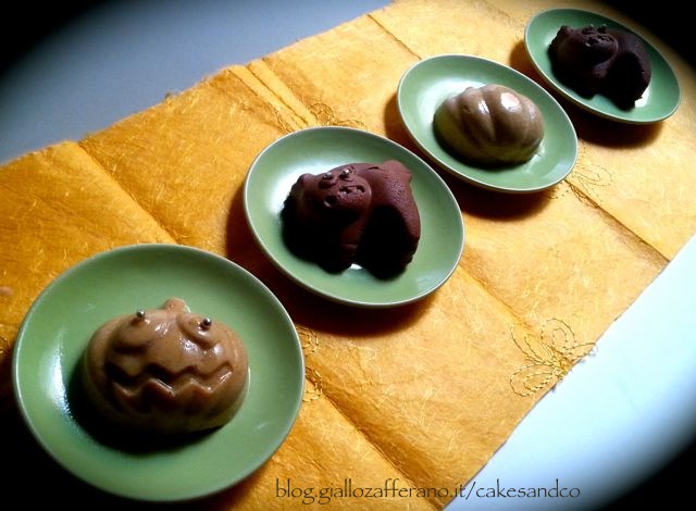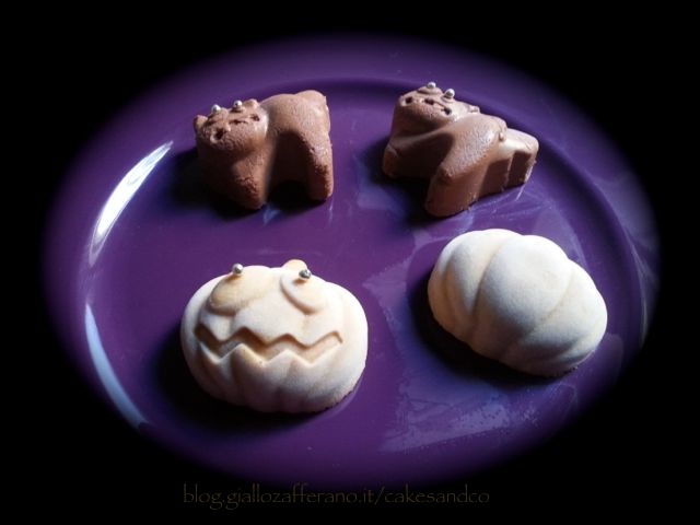 Ho comprato alla fiera di Firenze uno stampo in silicone a forma di gattino e zucca per Halloween, inizialmente la mia idea era quella di fare delle mini tortine e rivestirle poi con la pdz, ma all’interno della confezione ho trovato la ricetta di Montersino della mousse al cioccolato bianco, quindi ho subito cambiato idea e deciso di fare anch’io la mousse. Peccato però che leggendo tutta la ricetta ho riscontrato l’utilizzo di una marea di coloranti per decorare i semifreddi e sinceramente l’idea di utilizzare dei coloranti su una mousse, per me che faccio le torte con la pdz colorata e poi non mangio la copertura della torta, era improponibile, quindi stravolgo tutta la ricetta del maestro e faccio due mousse: una zucca e cannella e l’altra al cioccolato fondente, così facendo i gattini e le zucche sono risultati rispettivamente meno arancioni e meno neri ma eliminando completamente i coloranti almeno sono diventati più salutari. Che dire spero vi piacciano, accompagnati con della crema pasticciera tiepida e qualche granella di amaretto sbriciolato vi assicuro sono buonissimi oltre che simpatici da vedere.