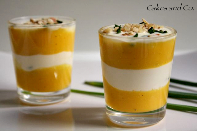 Sul fondo di ogni bicchiere ponete un cucchiaio di mousse al mango, continuate con un cucchiaio di crema di pecorino, poi un’altra cucchiaiata di mousse al mango e terminate con un cucchiaio di mousse al pecorino. Fate lo stesso per gli altri bicchierini fino ad esaurimento degli ingredienti. In fine decorate ogni bicchierino ponendo al centro un po’ di granella di nocciole e dell’erba cipollina tagliuzzata. Riponete in frigorifero fino al momento di servirli in maniera da far compattare per bene le due mousse.
