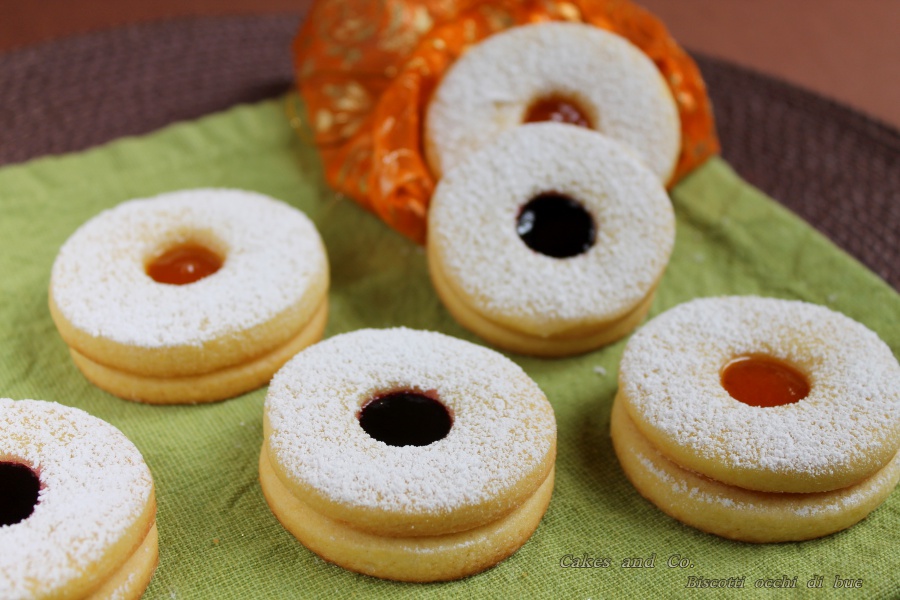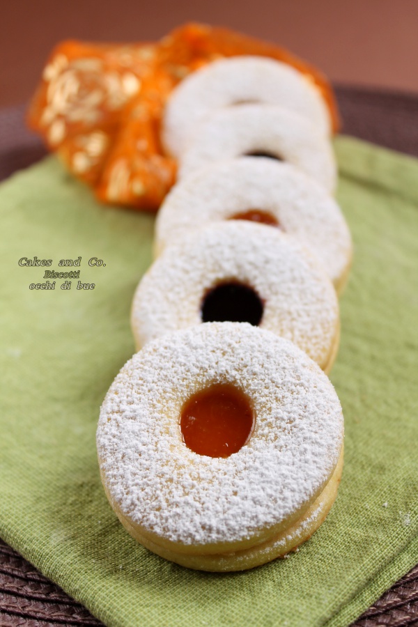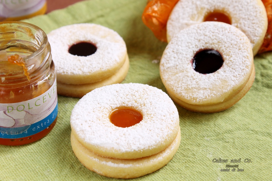 Oggi vi propongo gli occhi di bue, dei biscotti da tè di pasta frolla con un morbido ripieno di marmellata. Si faccia avanti chi non ne ha mai assaggiato uno! Sono un classico della pasticceria italiana, semplici da preparare ma allo stesso tempo buonissimi. L’idea per prepararli mi è venuta avendo in casa delle mini confezioni di marmellate e confetture regalatemi da Maria Paola, ex architetto che ha deciso di seguire la sua passione dando vita, proprio qui a Firenze, a Dolceverde un piccolo laboratorio, in cui crea marmellate e confetture artigianali. La particolarità delle sue confetture di frutta sta nel metodo che Maria Paola utilizza nel prepararle. Infatti oltre ad essere prive di conservanti, additivi ecc., così come tutte le altre specialità che produce, la frutta utilizzata per le confetture e le marmellate viene concentrata, grazie ad una pentola particolare, utilizzando la tecnica del sotto vuoto, che permette di estrarrre l’acqua dalla frutta sotto forma di vapore a temperature relativamente basse rispetto agli standard normali. Ciò fa sì che le qualità organolettiche della frutta rimangano intatte e che sia sufficiente una aggiunta di zucchero bassa per permetterne la conservazione ottimale, perché il processo di lavorazione porta naturalmente il prodotto ad una gradazione zuccherina elevata. Insomma al di là dei tecnicismi, il risultato, come ho avuto modo di provare, è una confettura che mantiene inalterato il colore e il sapore della frutta una vera squisitezza insomma. Maria Paola ho avuto il piacere di conoscerla alla mostra dell’Artigianato di Firenze grazie a Qualita, un interessantissimo progetto il cui scopo è quello di creare una rete di eccellenze del comparto enogastronomico composta da piccoli produttori che realizzano prodotti agroalimentari unici e che condividono alcuni valori di fondo quali la territorialità, la tipicità, la qualità, la tracciabilità, l’ecosostenibilità e la eticità delle loro produzioni, allo scopo di metterli in contatto con gli operatori del settore e di farli conoscere al grande pubblico. Oltre a Maria Paola e al suo Dolceverde, sempre grazie a Qualita, ho avuto modo di conoscere i prodotti di altre aziende locali, come i Cantucci della Pasticceria Fiorentina con sede a Motespertoli, che dal 1970, prima come panificio e poi anche come pasticceria, delizia i palati del piccolo borgo con i dolci della tradizione toscana e non, ed infine i vini del Podere Ghisone sempre vicino a Montespertoli, dove Luca con alle spalle una lunga tradizione vinicola, produce vini biologici nel rispetto della terra e dei suoi frutti con un occhio attento, però, anche alle nuove tecnologie che gli permettono di ottenere ottimi vini riducendo al minimo la quantità dei solfiti aggiunti.