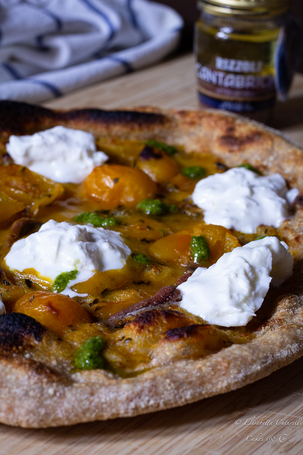 La Pizza semi integrale alle alici, pomodorini gialli, burrata e pesto è un mix perfetto di ingredienti della tradizione gastronomica italiana con una sola contaminazione: le alici del mar Cantabrico, perché di alici si sa è pieno il mare, ma quelle del Cantabrico per il loro sapore dolce, raffinato e intenso sono sicuramente una delle specie migliori, le mie in questo caso son quelle Rizzoli Emanuelli.