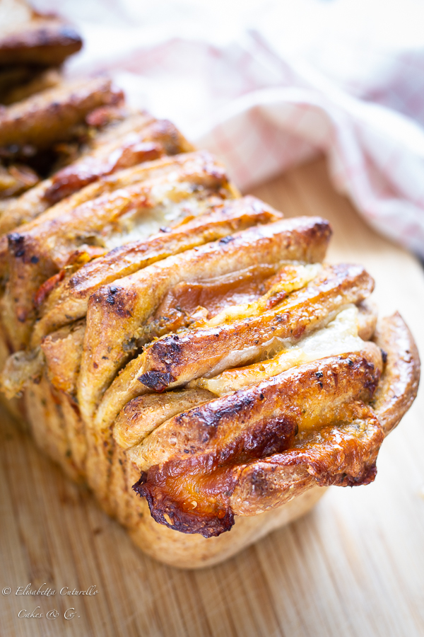 Pull apart bread salato in inglese significa “pane separabile” infatti la caratteristica di questo pane sta proprio nel fatto che per la forma che gli si da le singole fette si staccano facilmente con le mani avendo in ognuna di esse un perfetto equilibrio tra pane e farcitura. La cosa lo rende un pane davvero conviviale perfetto per un aperitivo tra amici o un buffet informale, ma anche per rendere ancora più speciale un pranzo o una cena.