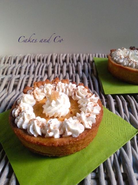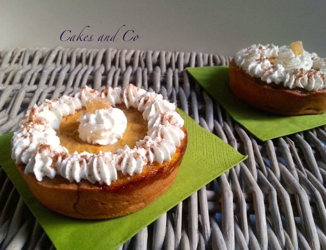 Riempite i gusci di frolla ormai cotti con questo ripieno e infornate nuovamente per circa 15’/20′ minuti a 180° fino a quando il ripieno non si sarà compattato. Sfornate e lasciate raffreddare completamente prima di servire decorando le crostatine con ciuffi di panna montata su cui distribuirete un poco di cannella e pezzettini di zenzero candito.