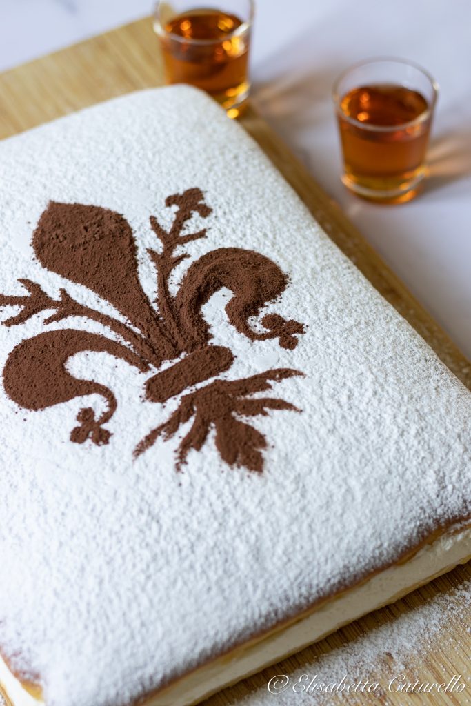 - Una volta che la schiacciata sarà raffreddata potete servirla vuota oppure farcirla come ho fatto io. Se volete farcirla tagliatela in due e farcitela con la panna che avrete precedentemente montato assieme ai 100g di zucchero quindi ricomponetela. In ogni caso che sia vuota o farcita non può mancare la decorazione. Spolverate la superficie della vostra schiacciata con abbondante zucchero a velo e poi posizionate al centro lo stancil del giglio fiorentino e spolverateci sopra il cacao amaro. Togliete delicatamente lo stancil e la vostra schiacciata fiorentina è pronta per essere servita.