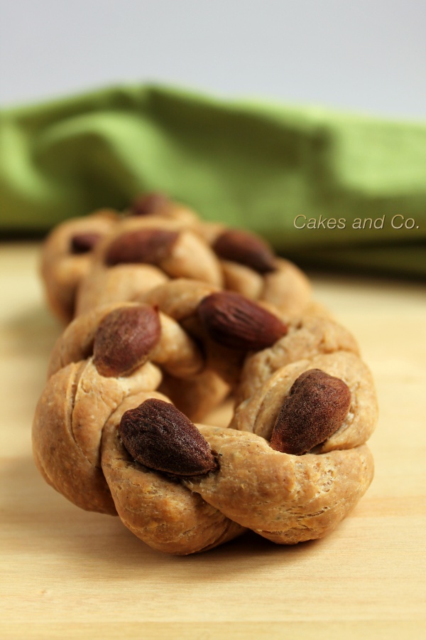 Ponete i taralli così formati su due placche da forno rivestite con carta forno, copriteli con pellicola trasparente e fateli lievitare nuovamente altre 2/ 3 ore. Prima di infornarli ponete, esercitando una discreta pressione, nei quattro punti cardinali di ogni tarallo una mandorla che avrete prima inumidito leggermente con dell’acqua per evitare che dopo la cottura si stacchi dai taralli.