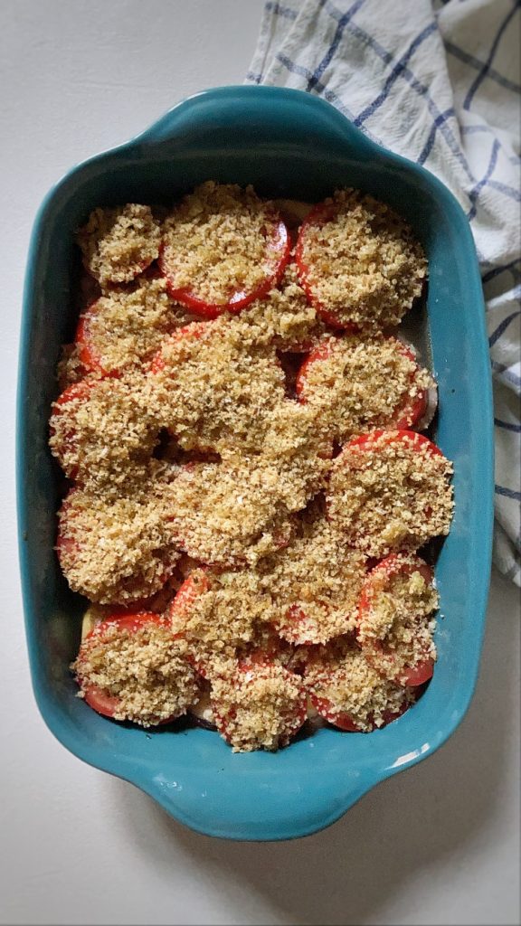 Un piatto unico che profuma d’estate, patate profumate con cipolla rossa di Tropea e pomodori con una panatura croccante, un piatto leggero e profumatissimo e se nella panatura omettete il parmigiano in un colpo diventa anche vegano. Si può preparare in anticipo ed è ottimo sia appena tiepido che freddo.