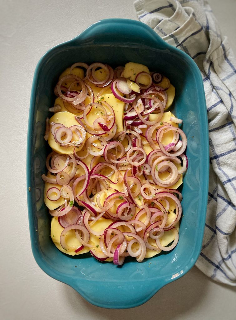 In una teglia, io ne ho usata una rettangolare, ponete le patate e la cipolla, creando un primo strato.