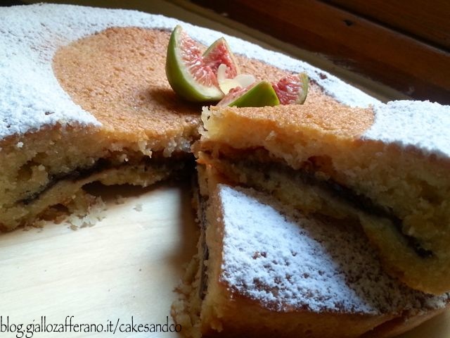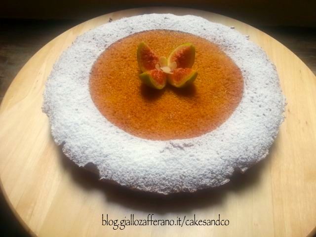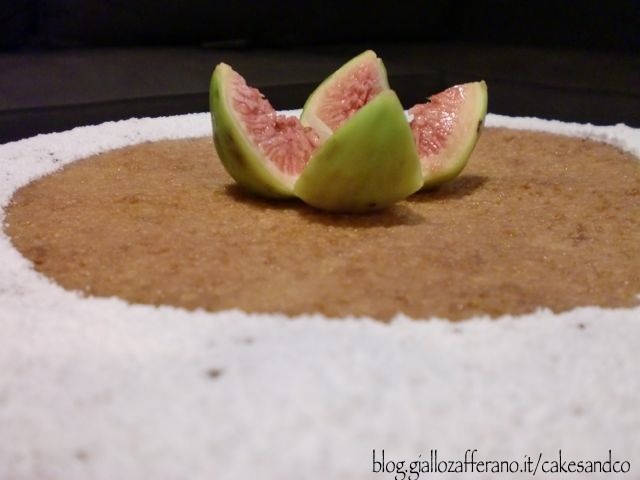 Quando la torta si sarà raffreddata ponetela su un piatto da portata e decoratela come più vi piace. Io ho cosparso i bordi della torta con dello zucchero a velo, riparando il resto della torta con un piatto capovolto per evitare che lo zucchero arrivasse su tutta la superficie, ho quindi tolto il piatto e ho posto al centro della torta un fico semi tagliato in 4 spicchi che ha preso così la forma di un fiore e all’interno del fico ho posizionato 4 lamelle di mandorla.