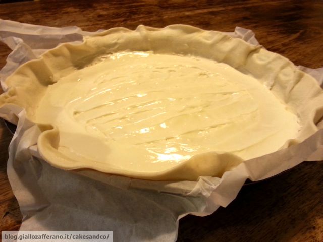 Stendete la sfoglia, con tutto l’involucro di carta forno, su una tortiera rotonda, bucherellate con una forchetta la pasta in modo da aiutare durante la cottura la fuoriuscita del vapore dalla pasta.