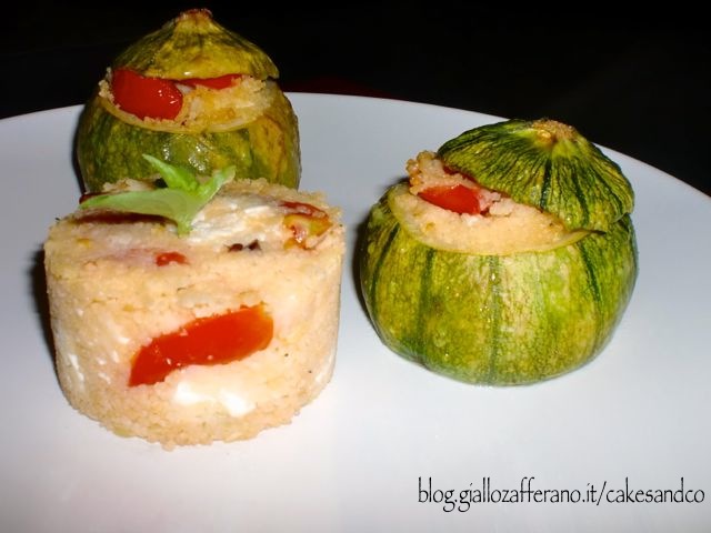 Ponete in una padella un filo d’olio d’oliva e fatevi rosolare lo spicchio d’aglio in camicia schiacciato, aggiungete la polpa delle zucchine che avete tenuto da parte, i pomodorini pachino lavati e tagliati a metà, le olive nere che avrete privato del nocciolo, pepate e lasciate cuocere il tutto per 5′ minuti. Spegnete il fuoco eliminate lo spicchio d’aglio e aggiungete la feta tagliata a dadini, il couscous e il basilico spezzettato con le mani, amalgamate il tutto. (Io non ho salato le verdure perché la feta e le olive sono già abbastanza salate per i miei gusti).
