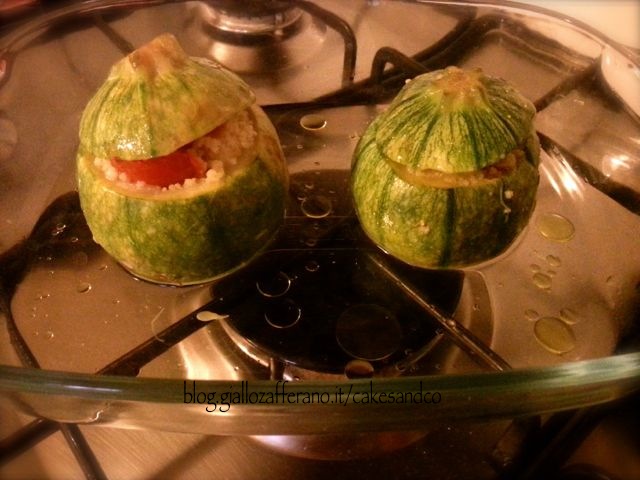 Salate le zucchine svuotate sia internamente che esternamente e riempitele con il ripieno di couscous, olive, feta, polpa di zucchina e pomodorini. Salate anche le calottine di zucchina, che avete messo da parte, e posizionatene una su ogni zucchina ripiena. Ponete quindi le zucchine ripiene in una pirofila in cui avrete versato mezza tazzina d’acqua, condite le zucchine con un filo d’olio d’oliva.
